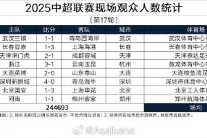 2025中超联赛现场观众人数统计(第17轮)